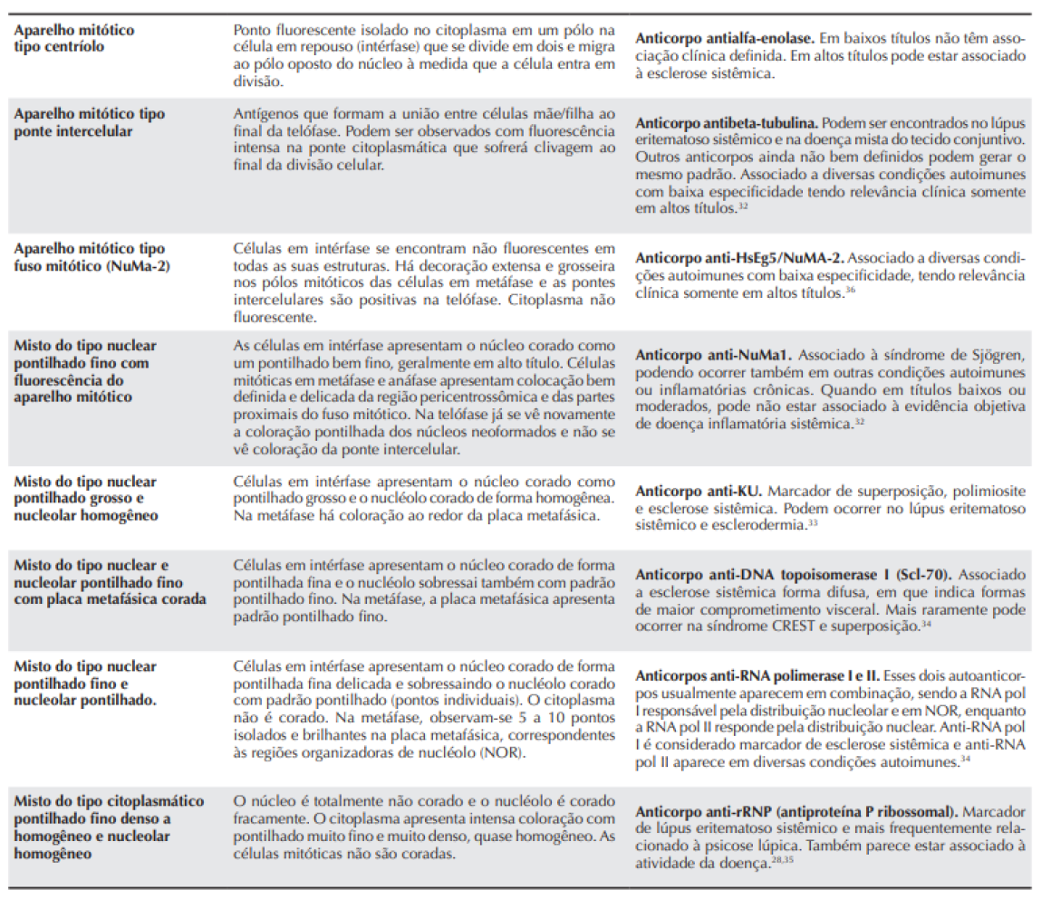 Autoanticorpos contra alguns antígenos têm associação bastante específica com determinadas doenças autoimunes ou ao estado de autoimunidade em si, enquanto outros ocorrem indiscriminadamente em indivíduos autoimunes e não autoimunes. Dessa forma, determinados padrões de fluorescência são mais específicos de doença autoimune enquanto outros ocorrem com frequência em indivíduos sadios ou em pacientes com outras enfermidades não autoimunes. Outro ponto a considerar é que o nível de autoimunidade fisiológica ou basal pode flutuar na dependência de sobrecargas a que o sistema imunológico seja exposto. Tem sido demonstrada a presença de autoanticorpos desencadeada transitoriamente por infecções (principalmente virais), por medicamentos e por neoplasias.